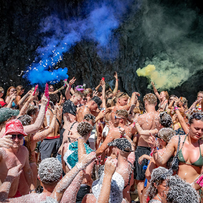 Keep cool in the 35-degree Greek sunshine with Co2 Cannon Freeze Jets operating exclusively on board. This is your opportunity to jump aboard the Kavos party boat and sail to the clearest blue waters for a day of drinking, sunshine, and antics at sea – the perfect day to get your tan on!